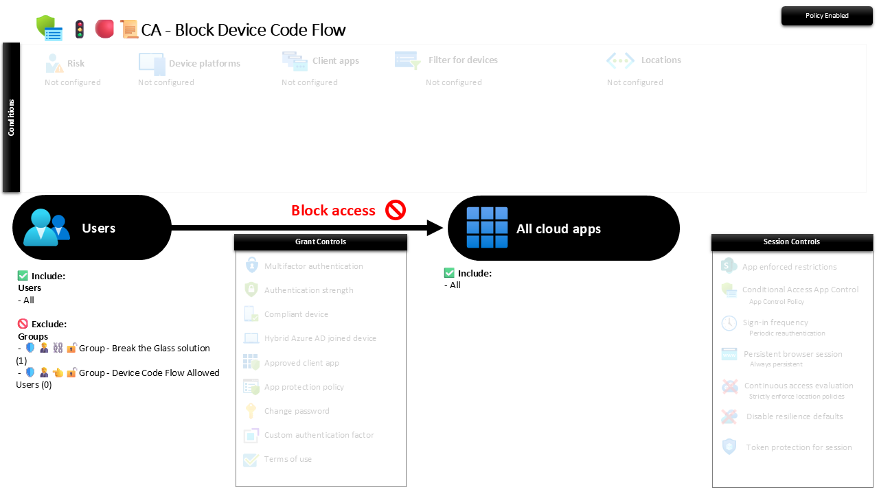 EntraConditionalAccessPolicies🚦🔴📜CA - Block Device Code FlowOn this page🚦🔴📜CA - Block Device Code Flow What this policy is for Combined with name 🔐 Configuration Overview 📌 Purpose and Impact 🧭 Governance & Security 🧠 Final Note