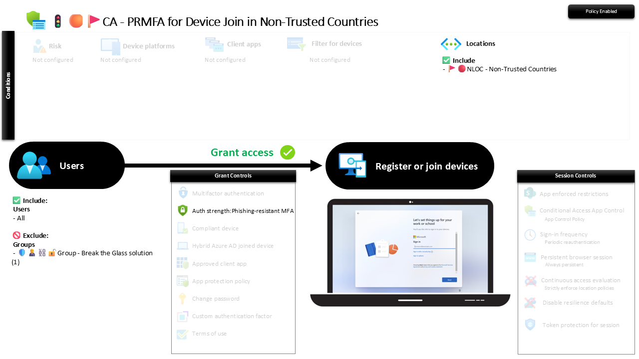 EntraConditionalAccessPolicies🚦🟠🚩CA - PRMFA for Device Join in Non-Trusted CountriesOn this page🚦🟠🚩CA - PRMFA for Device join in Non-Trusted Countries What this policy is for Combined with name 🔐 Configuration Overview 📌 Purpose and Impact 🧭 Governance & Security 🧠 Final Note