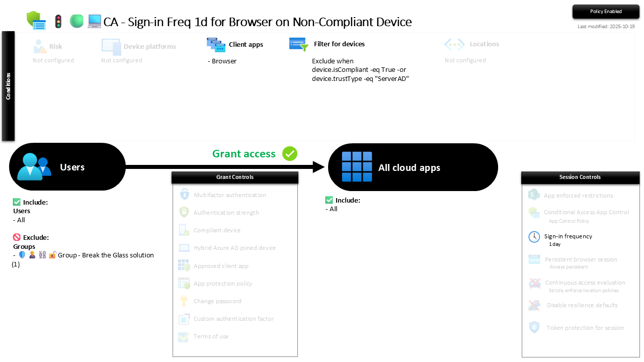 ConditionalAccessPolicies🚦🟢💻CA - Sign-in Freq 1d for Browser on Non-Compliant DeviceOn this page🚦🟢💻CA - Sign-in Freq 1d for Browser on Non-Compliant Device What this policy is for 🔐 Configuration Overview 📌 Purpose and Impact 🧭 Governance & Security 🧠 Final Note